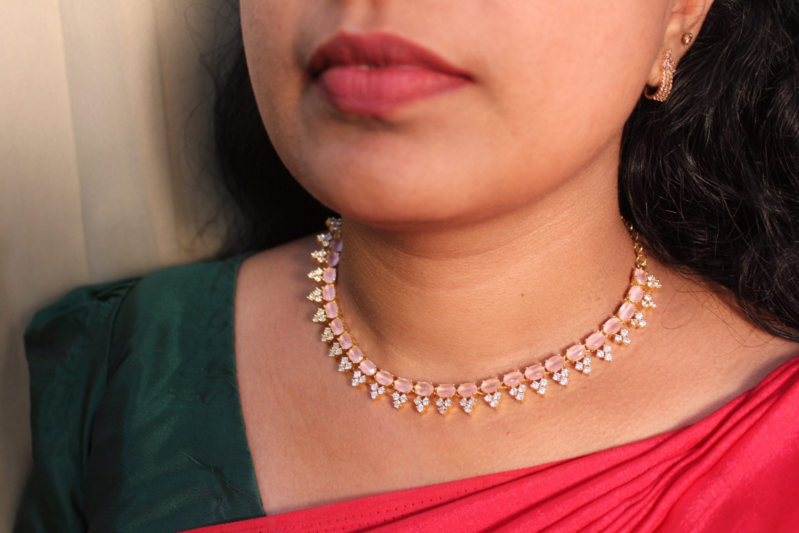 Elegant imitation gold-tone choker necklace featuring soft pink oval stones with sparkling diamond-like danglers, perfect for traditional wear.
