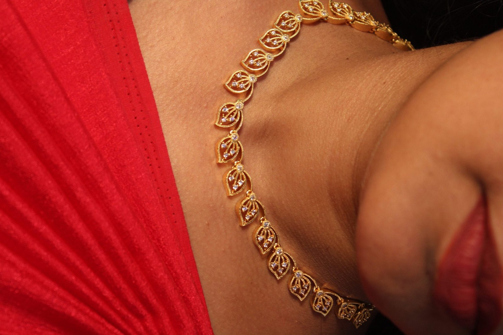 A close-fitting imitation gold choker designed with repeating leaf (paisley-inspired) motifs, highlighted with fine filigree work and small stone accents. It sits elegantly around the neck and is commonly worn with sarees and traditional Indian attire for weddings and festive occasions.