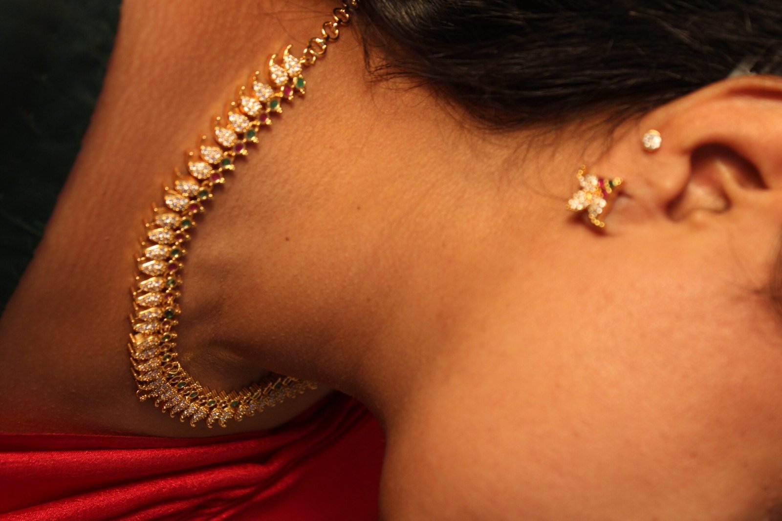 This is a traditional Indian gold choker necklace featuring a closely set row of diamond-like stones (CZ/Polki style) with green (emerald-tone) and red (ruby-tone) accents. The design has a classic temple–bridal look, sitting snugly around the neck, ideal for weddings and festive wear.The earrings are matching gold stud earrings with a floral/motif design, embellished with white stones and small red accents, designed to complement the choker without overpowering it.
