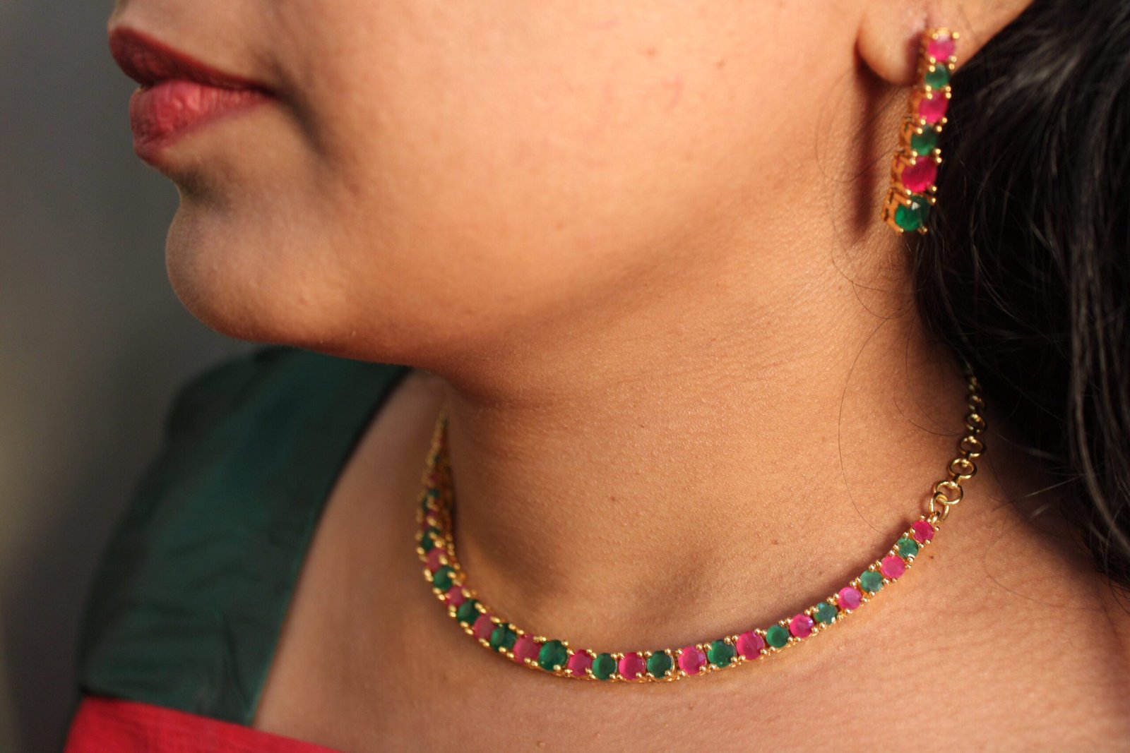 imitation Gold-tone choker necklace with alternating red and green stones, paired with matching traditional earrings.