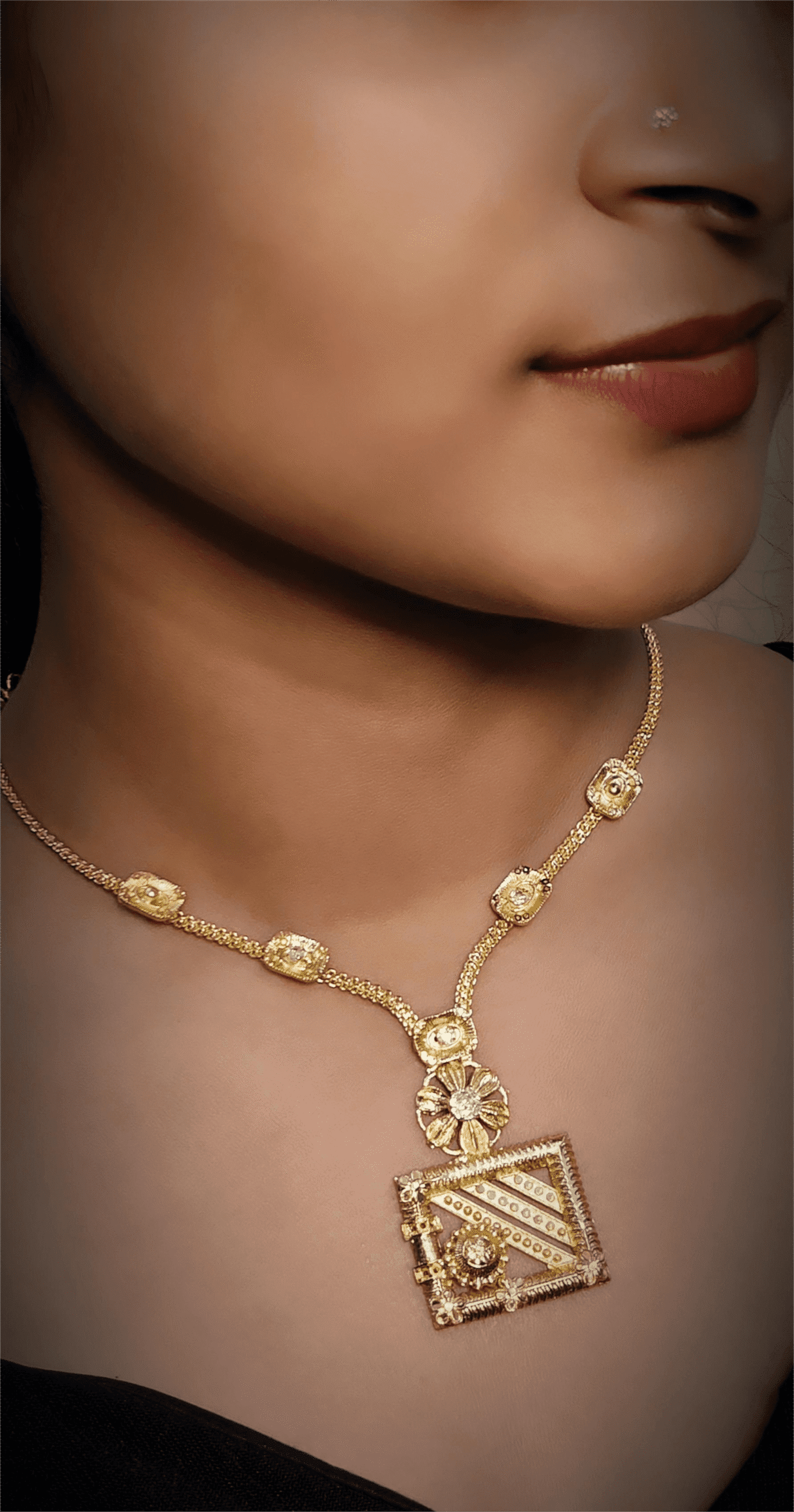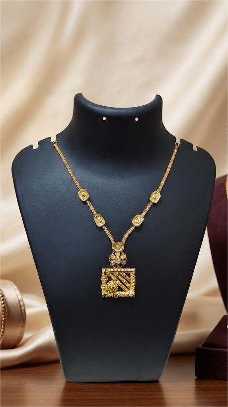 This is a imitation gold necklace displayed on a jewelry stand. The design features a chain with small decorative gold elements along it, leading to a pendant that has a geometric square design with intricate patterns. The style appears traditional with a modern geometric touch, suitable for festive or formal occasions.