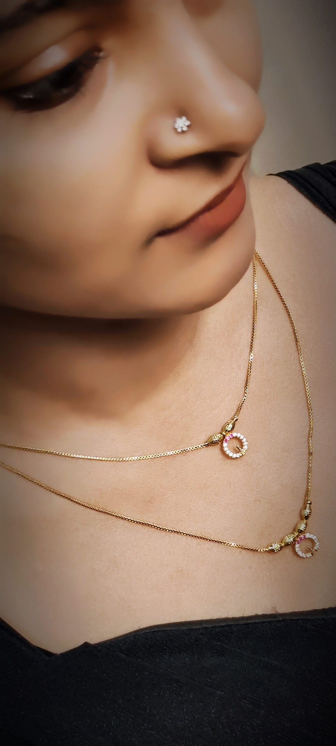 This is an elegant double-layer imitation gold-tone chain necklace featuring delicate ruby-colored stone accents. The design includes two fine chains of different lengths, each adorned with a small heart-shaped or floral-inspired stone setting. Subtle side motifs near the clasp add a refined touch, making it perfect for everyday wear as well as light festive occasions. The minimalist yet graceful style pairs beautifully with both traditional and modern outfits.