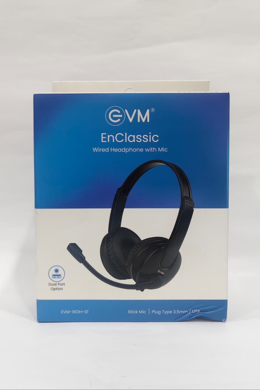 The EVM Enclassic Headphone is a comfortable and stylish audio solution designed for everyday use. It features high-quality stereo sound with clear vocals and deep bass, making it ideal for music, movies, online classes, and calls. The lightweight design with soft cushioned earcups ensures long-lasting comfort, while the adjustable headband provides a secure fit for all users. With a durable build and reliable wired connectivity, the EVM Enclassic delivers consistent performance without the need for charging.