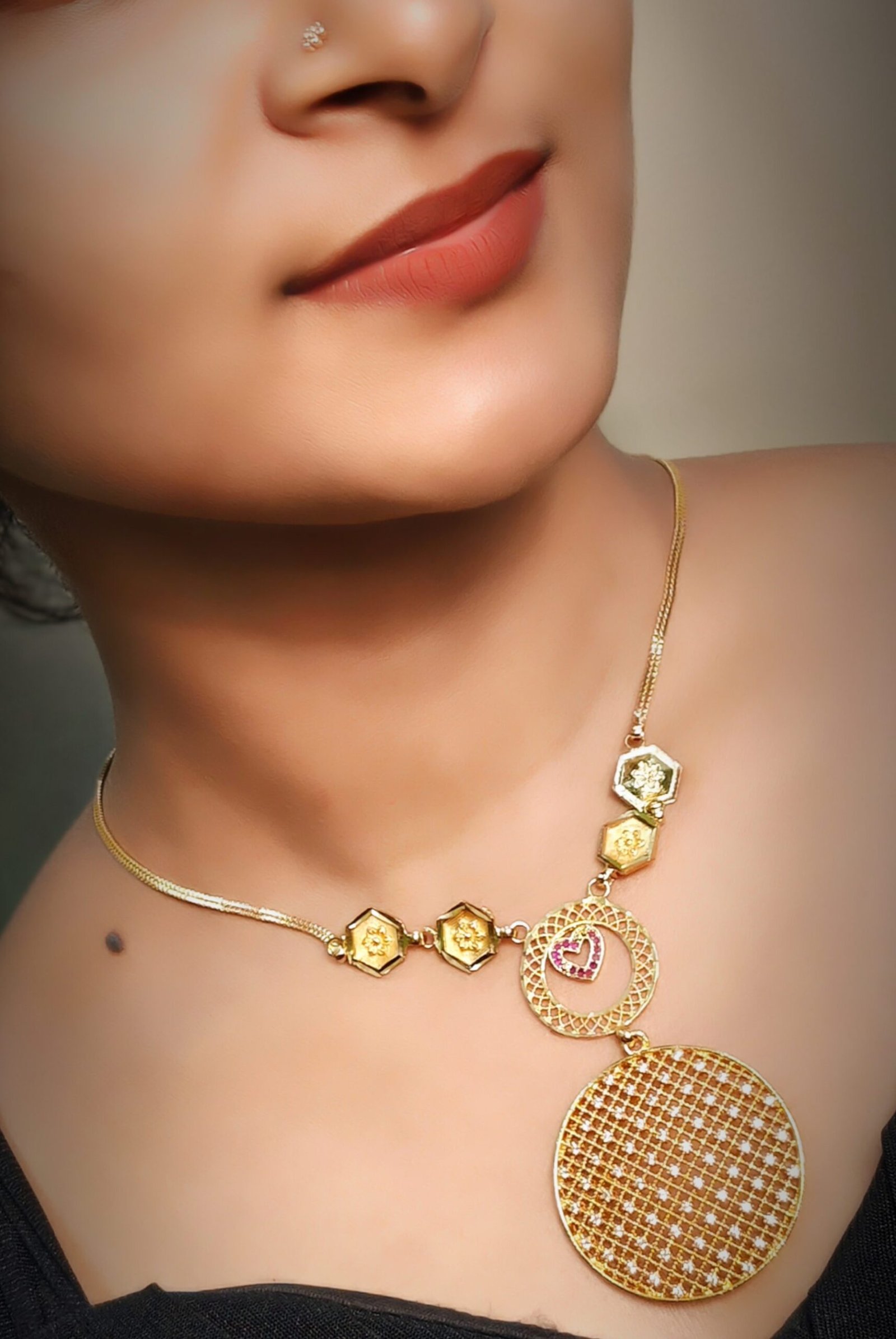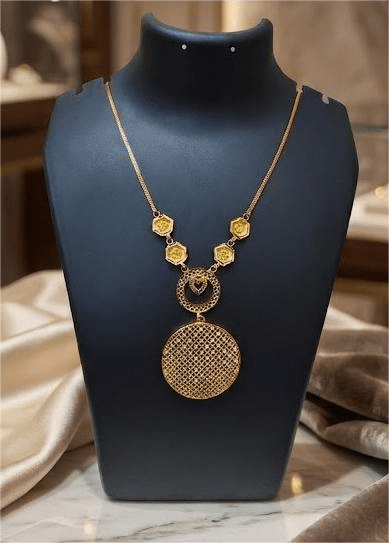 A beautifully crafted imitation gold necklace featuring hexagon-shaped floral motifs that lead to an intricately designed double-layered circular pendant. The pendant showcases fine lattice detailing, adding a touch of elegance and luxury. Perfect for festive occasions, weddings, and traditional attire, this necklace combines modern craftsmanship with classic charm.