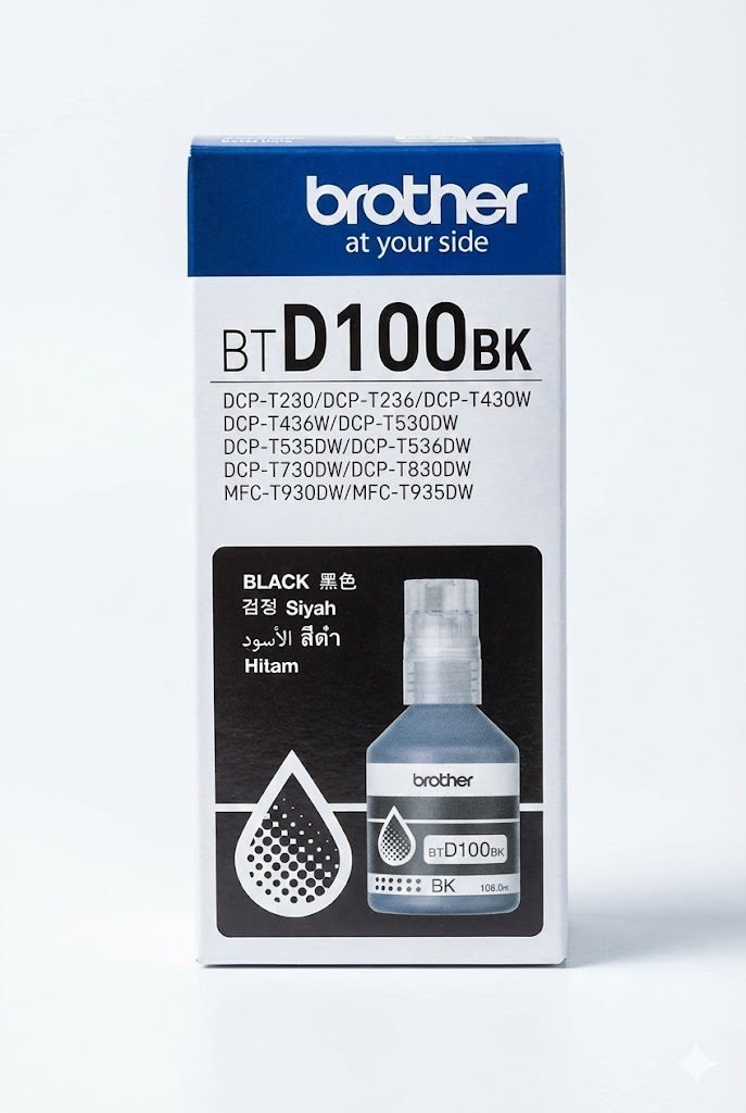 High-yield genuine black ink bottle from Brother (model BTD100). Designed for Brother ink-tank printers; delivers deep, sharp black printing for documents and graphics, with long-lasting performance and easy refill. Compatible with a wide range of Brother DCP and MFC ink tank printers.