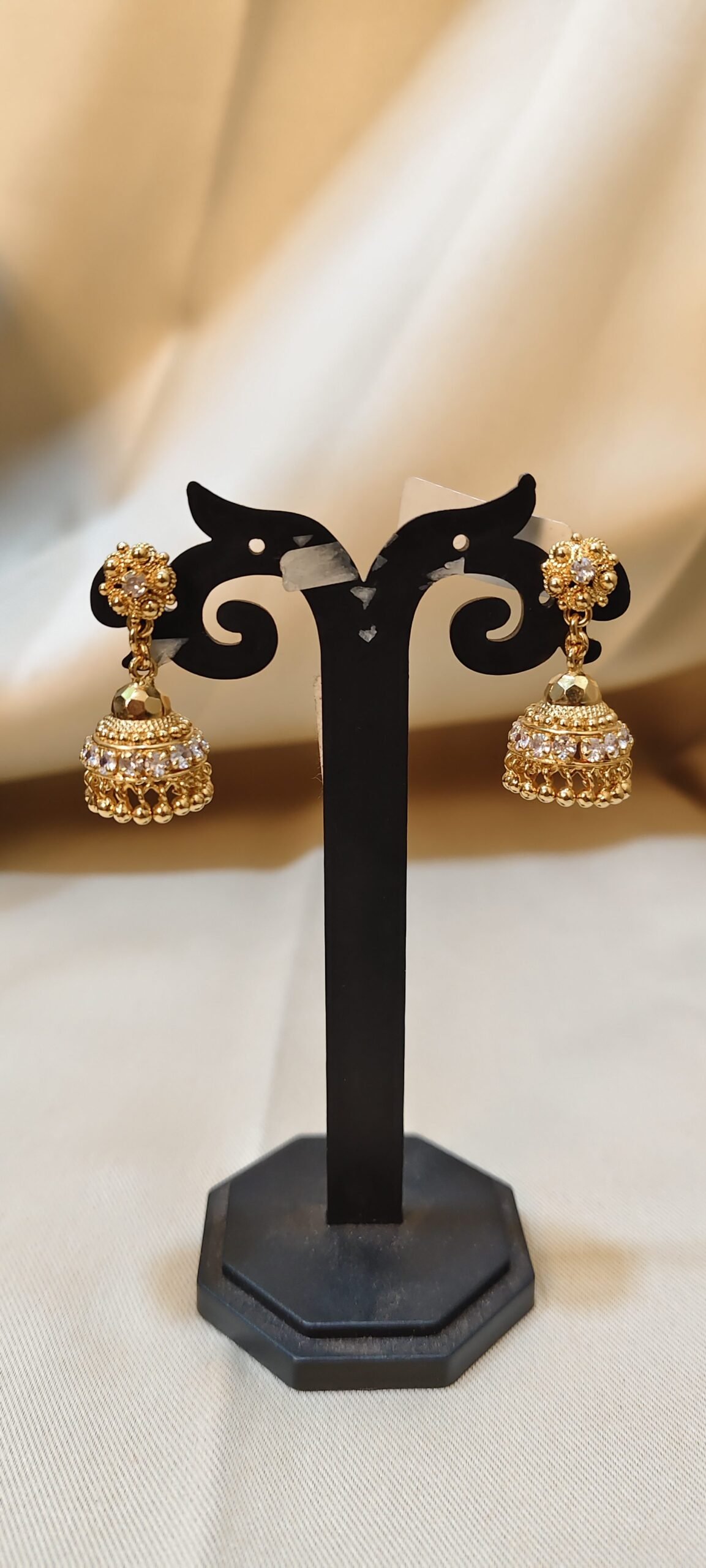 Elegant gold-tone imitation jhumka earrings featuring a floral stud top with sparkling stone accents, connected to a beautifully crafted bell-shaped dangler. The jhumka is adorned with clear crystal stones and finished with delicate bead detailing along the edge, giving it a rich, traditional look. Perfect for weddings, festive occasions, and ethnic wear, these earrings add classic charm and royal elegance.