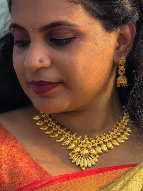 classic South Indian temple-style gold necklace featuring a series of intricately crafted gold motifs witThis is a classic South Indian temple-style gold necklace featuring a series of intricately crafted gold motifs with a prominent central pendant inspired by floral and deity design elements. The rich antique gold finish and detailed craftsmanship give it a regal, heritage look, perfect for weddings, festive occasions, and traditional sarees.h a prominent central pendant inspired by floral and deity design elements. The rich antique gold finish and detailed craftsmanship give it a regal, heritage look, perfect for weddings, festive occasions, and traditional sarees.