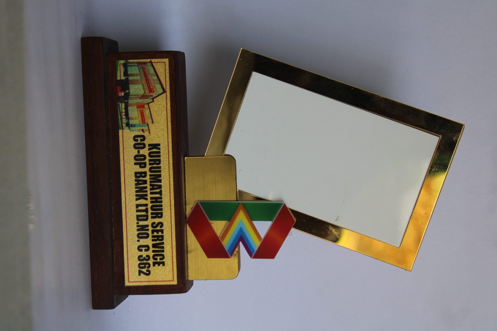 A colorful, abstract logo is present to the right of the frame and the plaque.