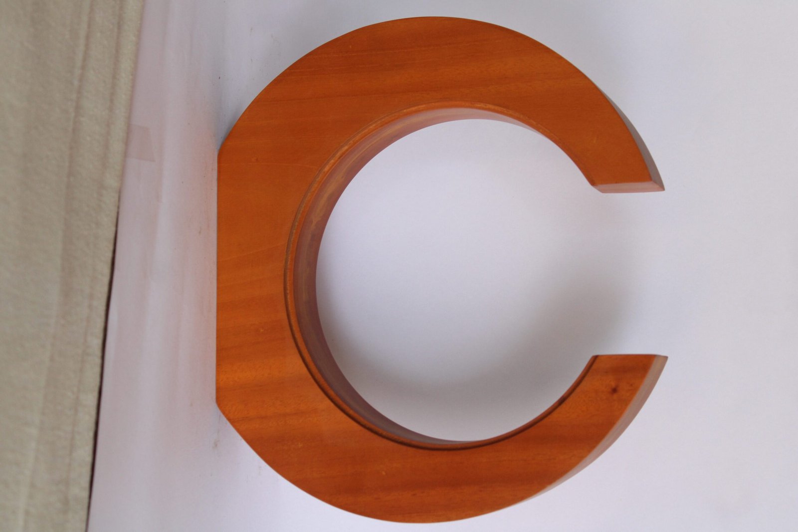 A polished wooden award stand with a curved, open circular design, crafted from natural wood and suitable for mounting logos, plates, or custom engravings for trophies and recognition awards.