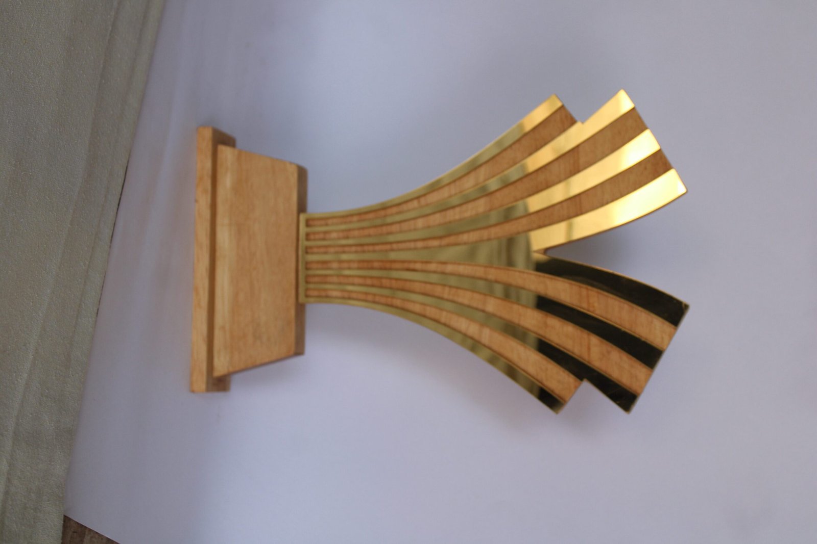 Modern wooden award trophy with a fan-shaped abstract design on a solid base, ideal for corporate recognition and appreciation awards.