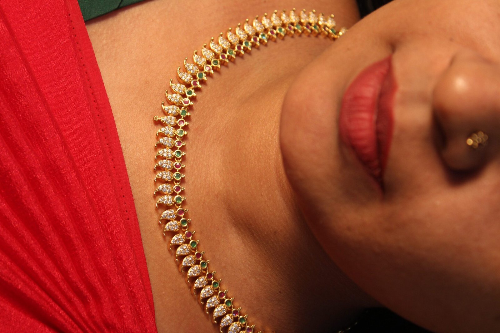 It features a crescent (chandram) motif design with diamond-cut stones and red & green gemstones, commonly seen in South Indian bridal and festive jewelry. The close-fitting style and repeating moon-shaped elements give it a rich, elegant look, perfect for sarees and traditional attire.