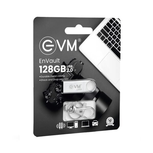A compact, metal-cased 128 GB flash drive from EVM, the EnStore 2.0 uses a standard USB 2.0 interface for plug-and-play data storage and transfer across PCs, laptops and other compatible devices. With a generous 128 GB capacity, it’s designed for storing documents, photos, videos or backups, and its portable build makes it easy to carry on the go — attachable to a keychain or bag for convenience.