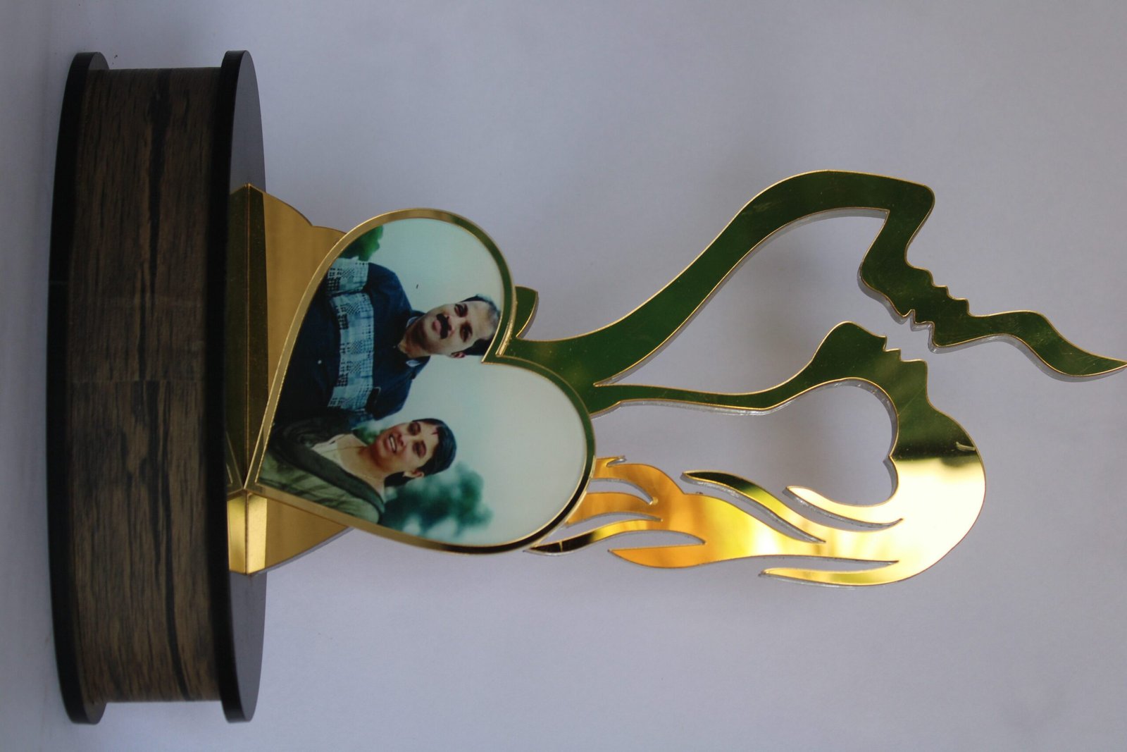 A personalized couple photo trophy featuring a heart-shaped design with a golden finish, symbolizing love and togetherness. Ideal as a romantic keepsake or gift for weddings, anniversaries, and special occasions.