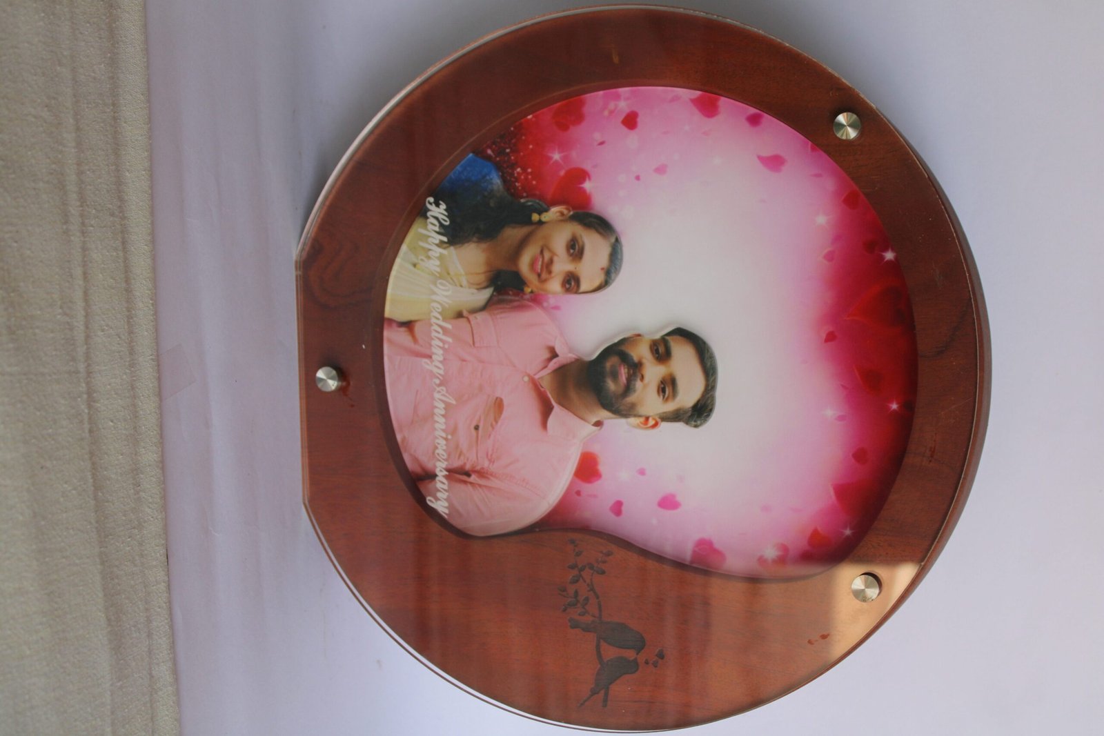 img 6834personalized wooden photo frame photo plaque.A round wooden frame with a smooth polished finish.