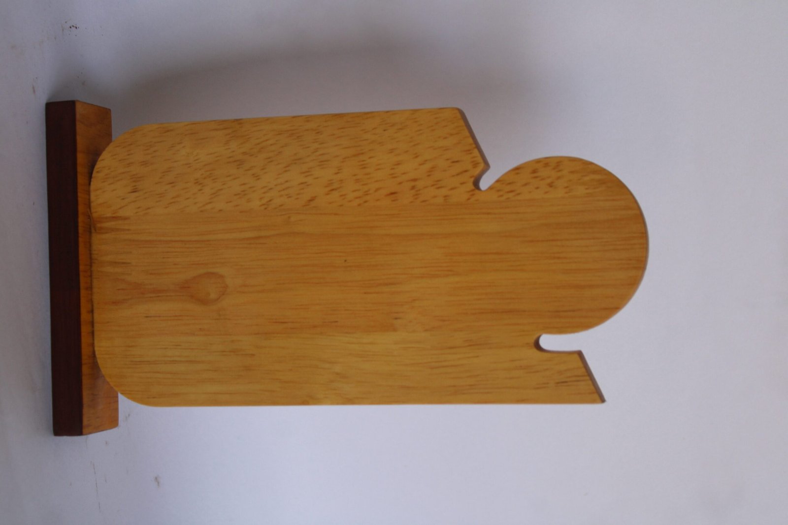 A handcrafted wooden trophy with a simple abstract shape, mounted on a wooden base. It appears to be a blank or back-side view, typically used for custom engraving, printing, or personalization for awards and mementos.