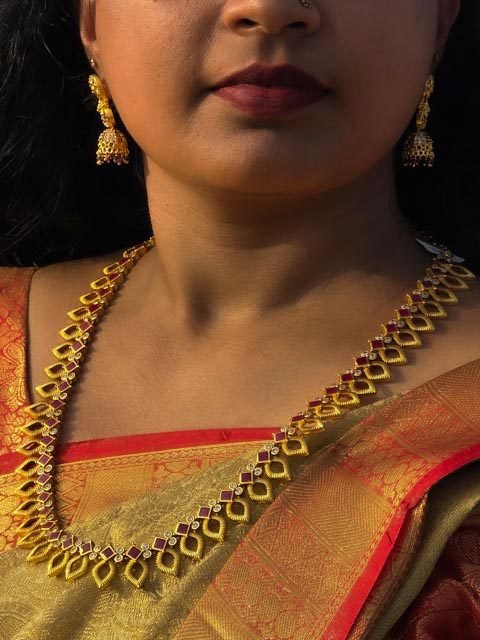 A traditional  necklace with geometric links and ruby-colored stone accents, perfect for festive and bridal wear