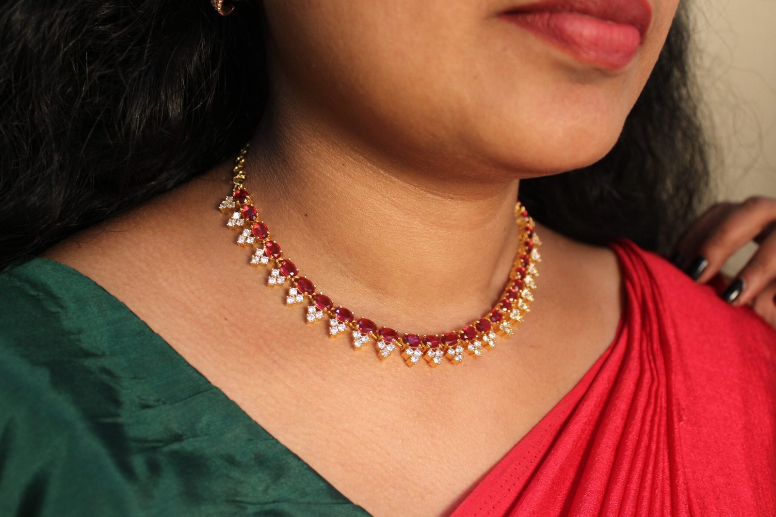 The close-fitting design with repeating ruby settings and sparkling white stones gives it an elegant, classic look, ideal for sarees and bridal wear.