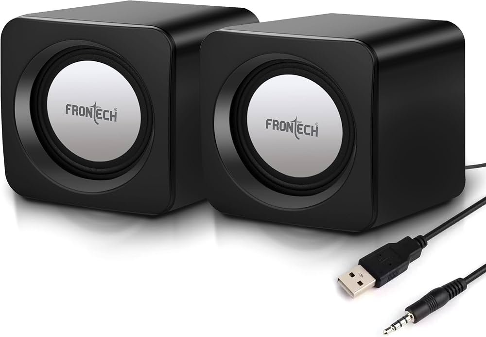 FRONTECH SPK-0002BLK is a compact 2.0-channel multimedia speaker set — designed for laptops, desktops or other devices — offering basic stereo audio with easy connectivity and USB power.