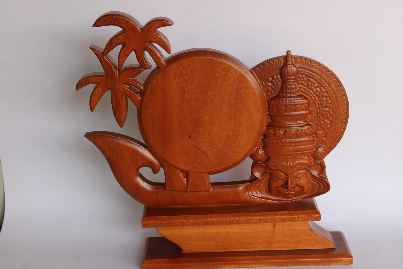 This is a handcrafted traditional wooden trophy featuring intricate carvings inspired by Indian cultural and temple motifs. The design includes a circular central plate for engraving, along with detailed elements such as palm trees, a ceremonial vessel, and a sculpted deity face. Made from polished natural wood, it has a rich finish and a sturdy base, making it ideal for cultural events, religious functions, heritage awards, and special recognition ceremonies.