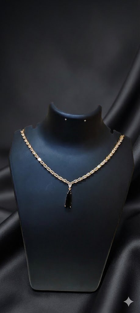 + Free ShippingThis is a necklace displayed on a jewelry bust. It appears to be a delicate chain, possibly gold or gold-plated, with a series of small linked elements and a black teardrop-shaped pendant hanging in the center. The design is elegant and simple, suitable for formal or semi-formal wear.