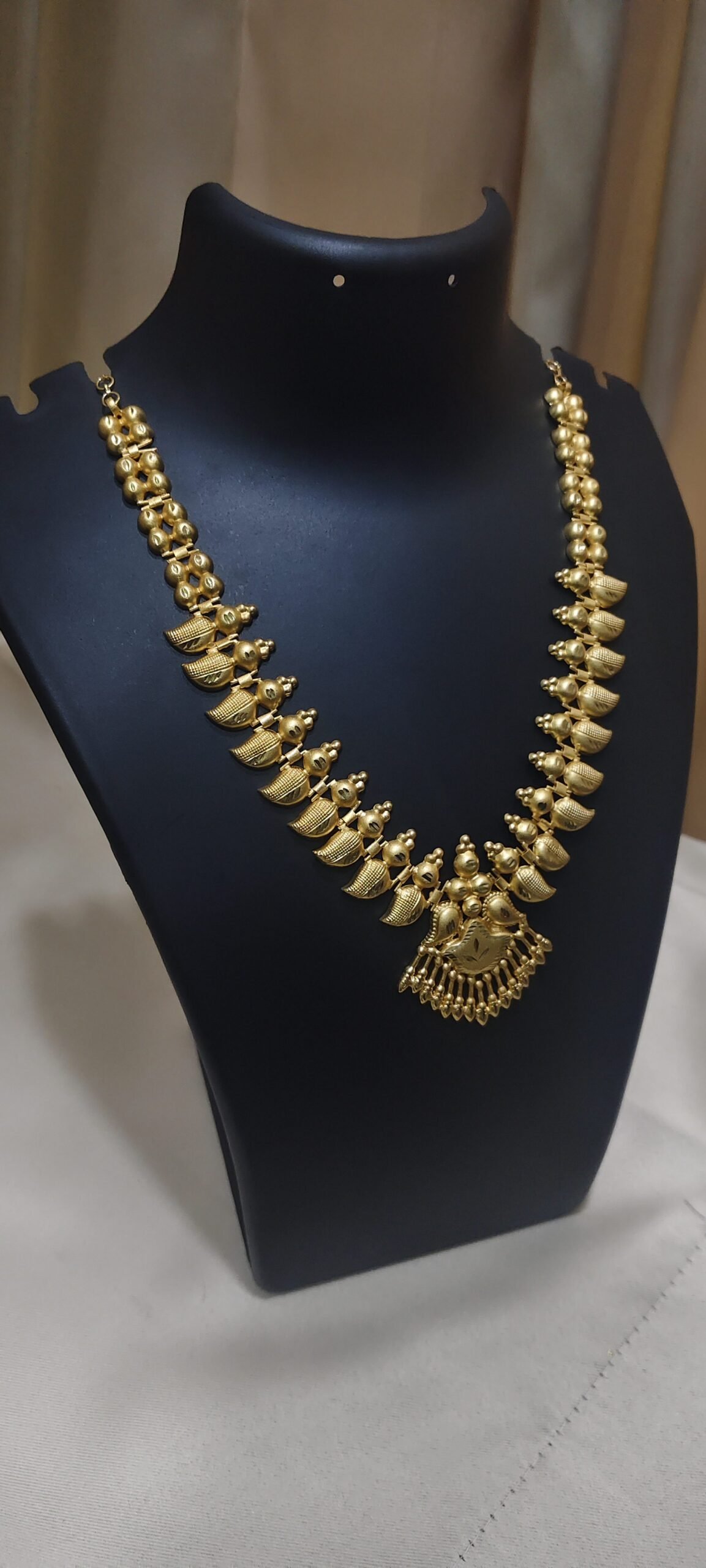 This is a traditional imitation gold necklace crafted in a temple-inspired design. It features a structured chain with antique-finish gold beads and decorative leaf-shaped motifs, highlighted by a central ornate pendant with hanging bead details. The necklace reflects classic South Indian craftsmanship, giving it a rich and elegant ethnic appeal.