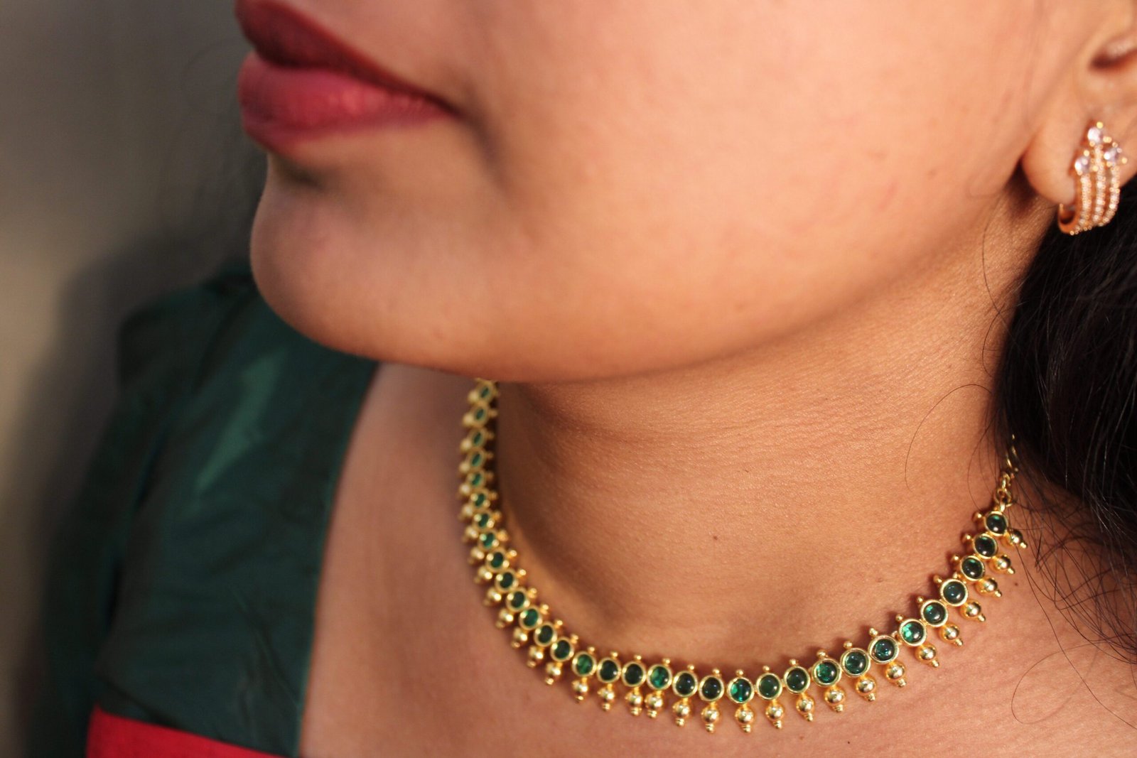 Design details: Each green stone is bordered with gold, with small dangling gold bead drops along the bottom edge