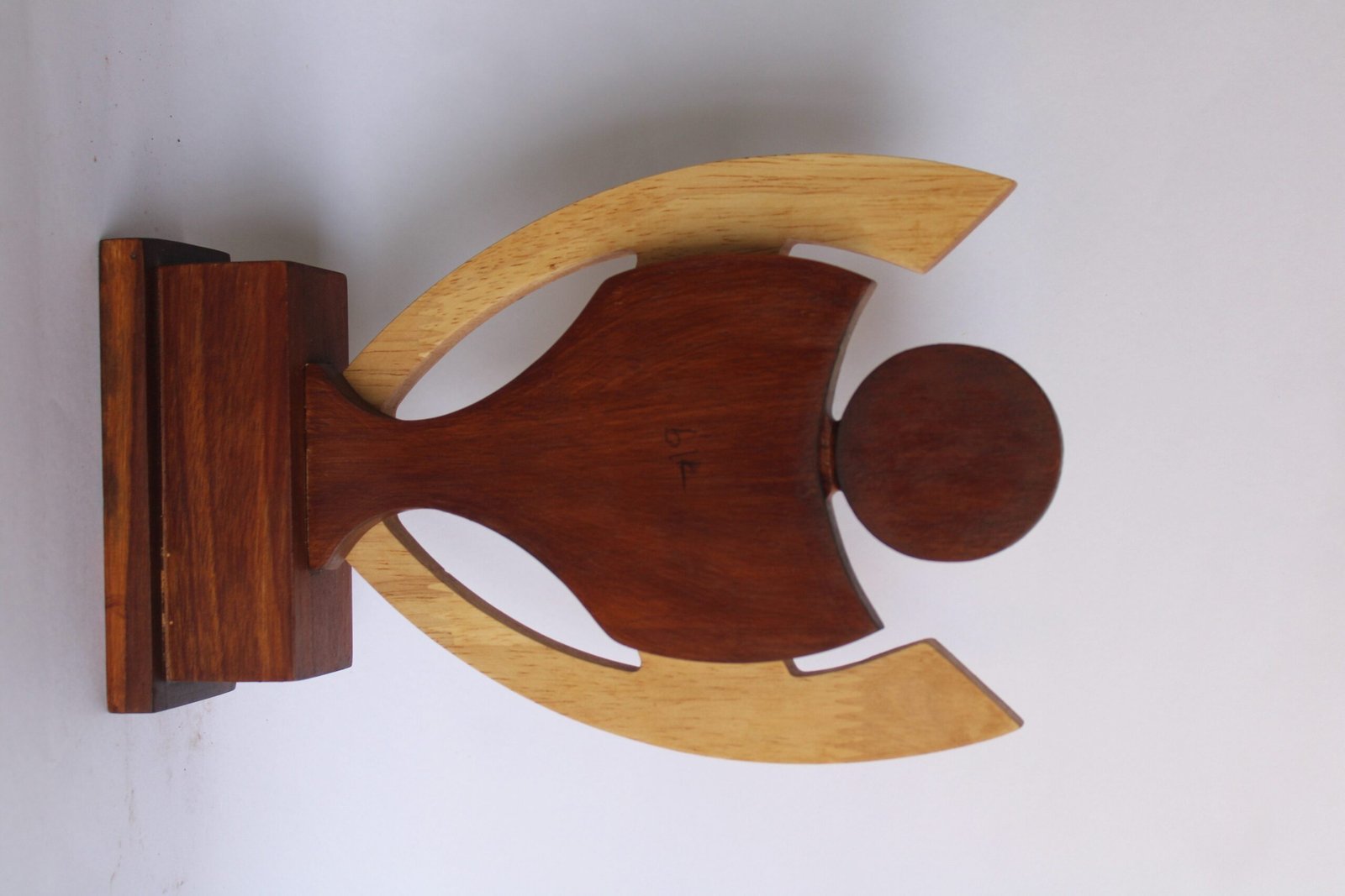A handcrafted wooden trophy featuring an abstract human figure with raised arms, symbolizing achievement, excellence, and success.